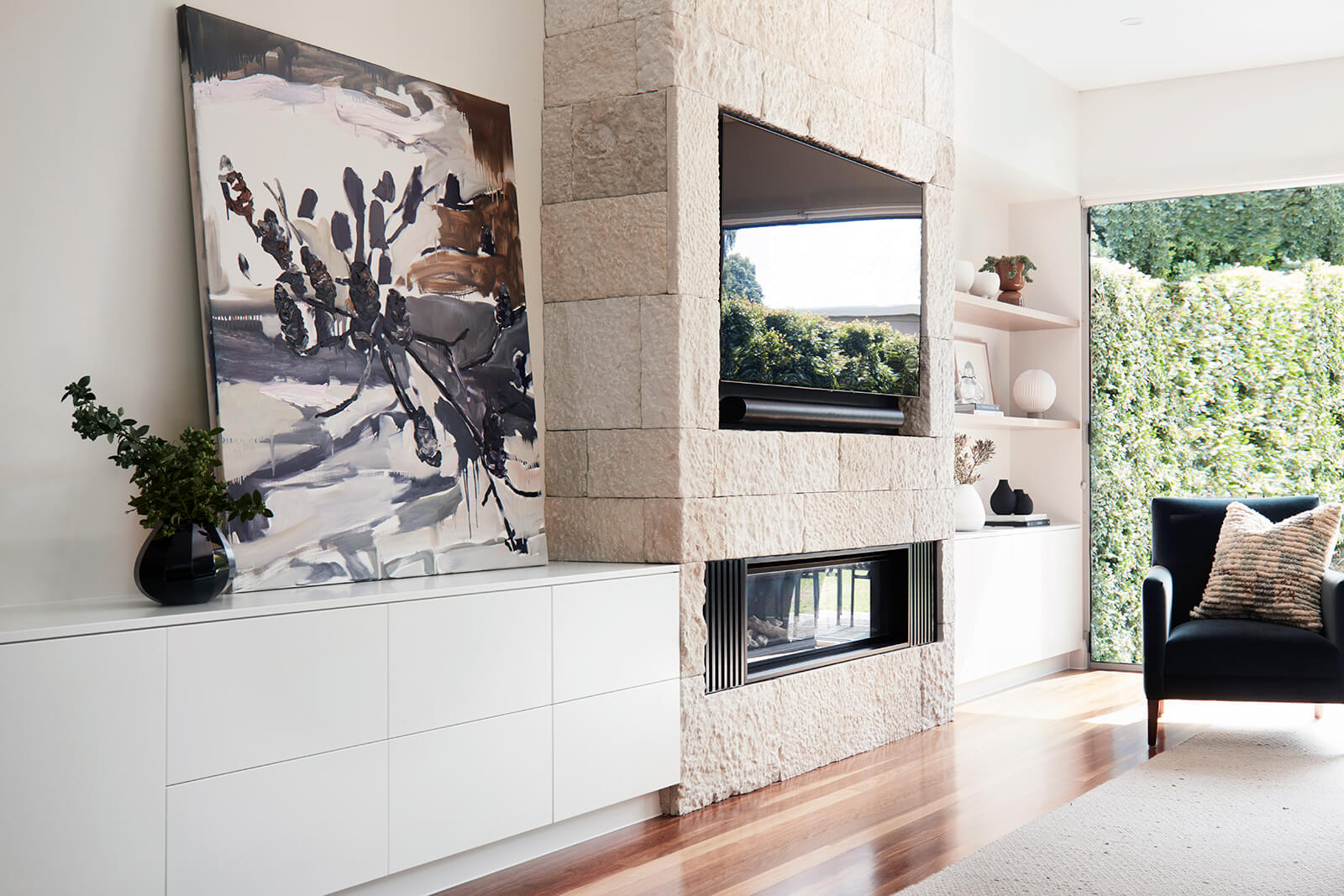 When Leah was asked to redesign a living room in the heart of Bronte, she was drawn to a feeling of calm, warmth, and seaside sophistication. The coastal home was birthed a new and improved living area with a sandstone fireplace, which seamlessly blended with existing furniture.