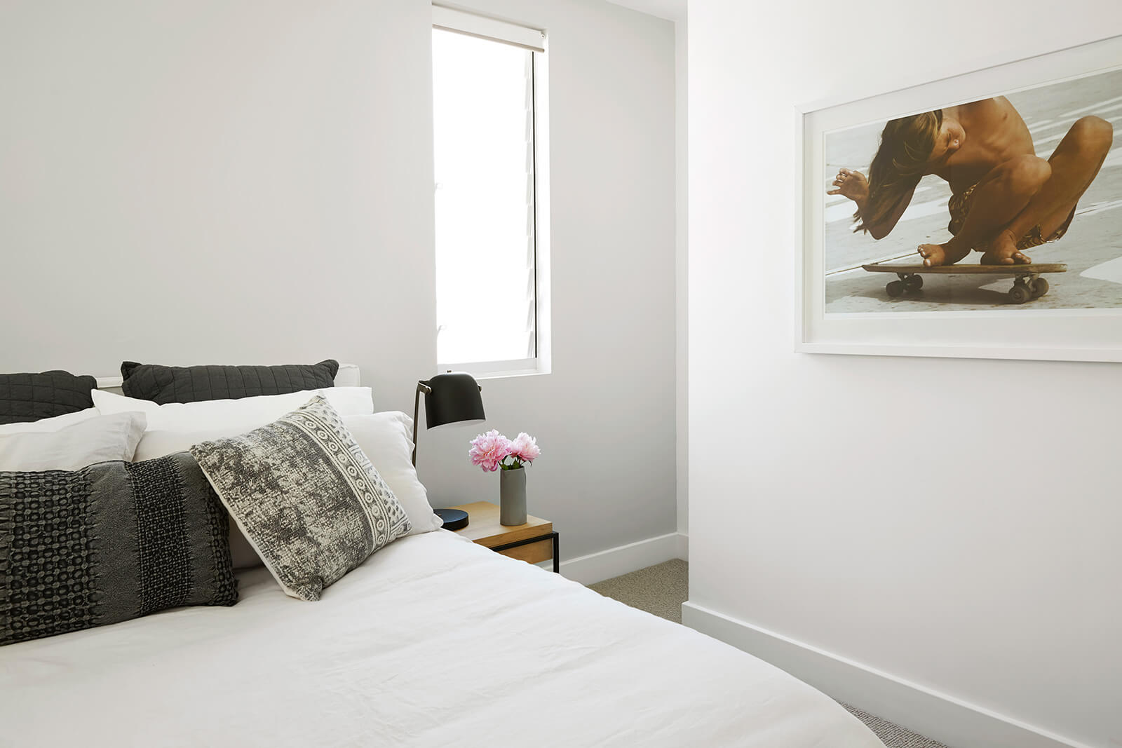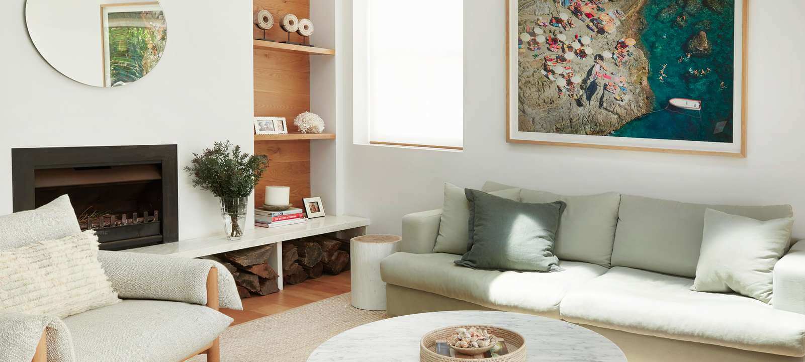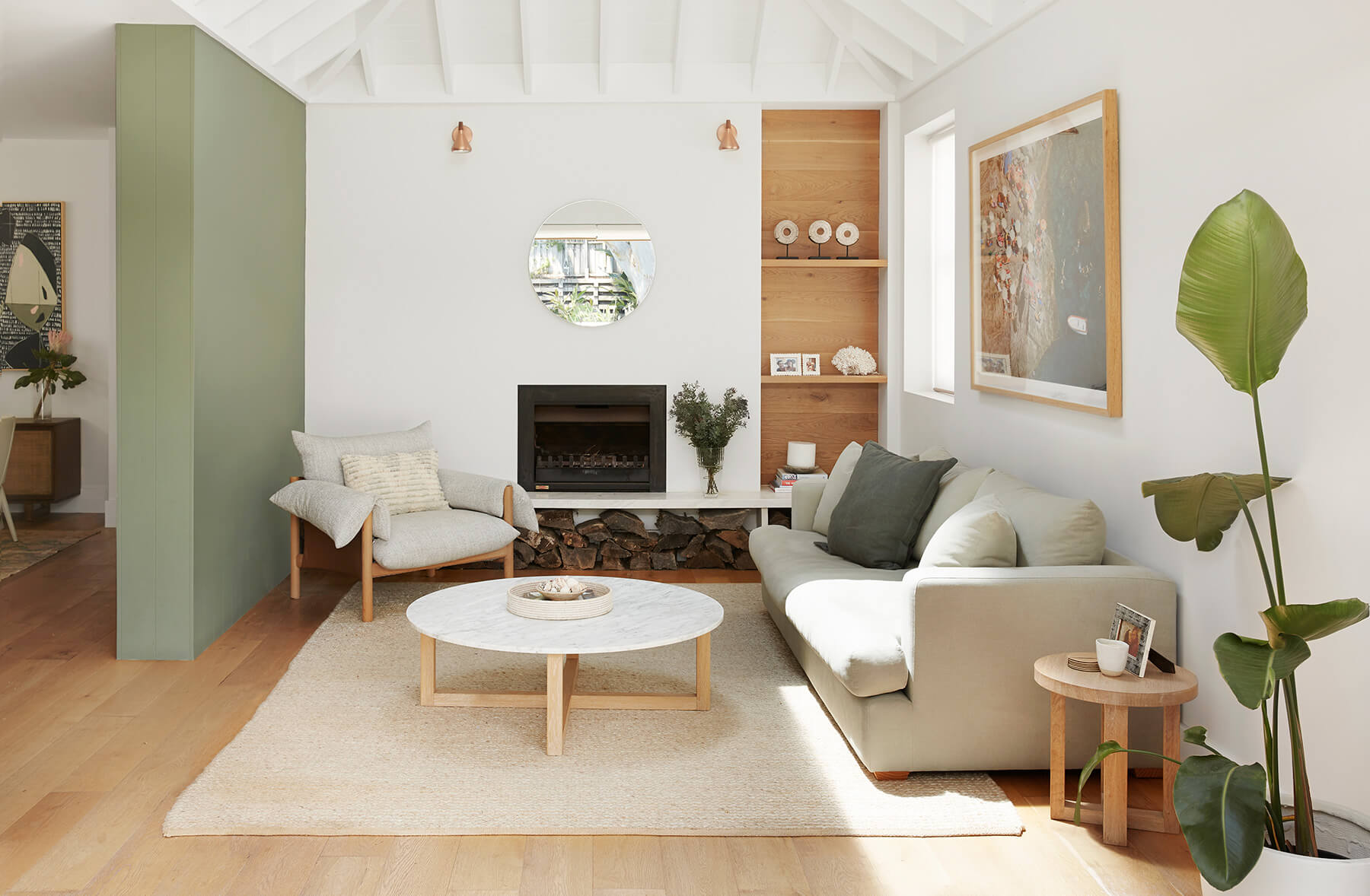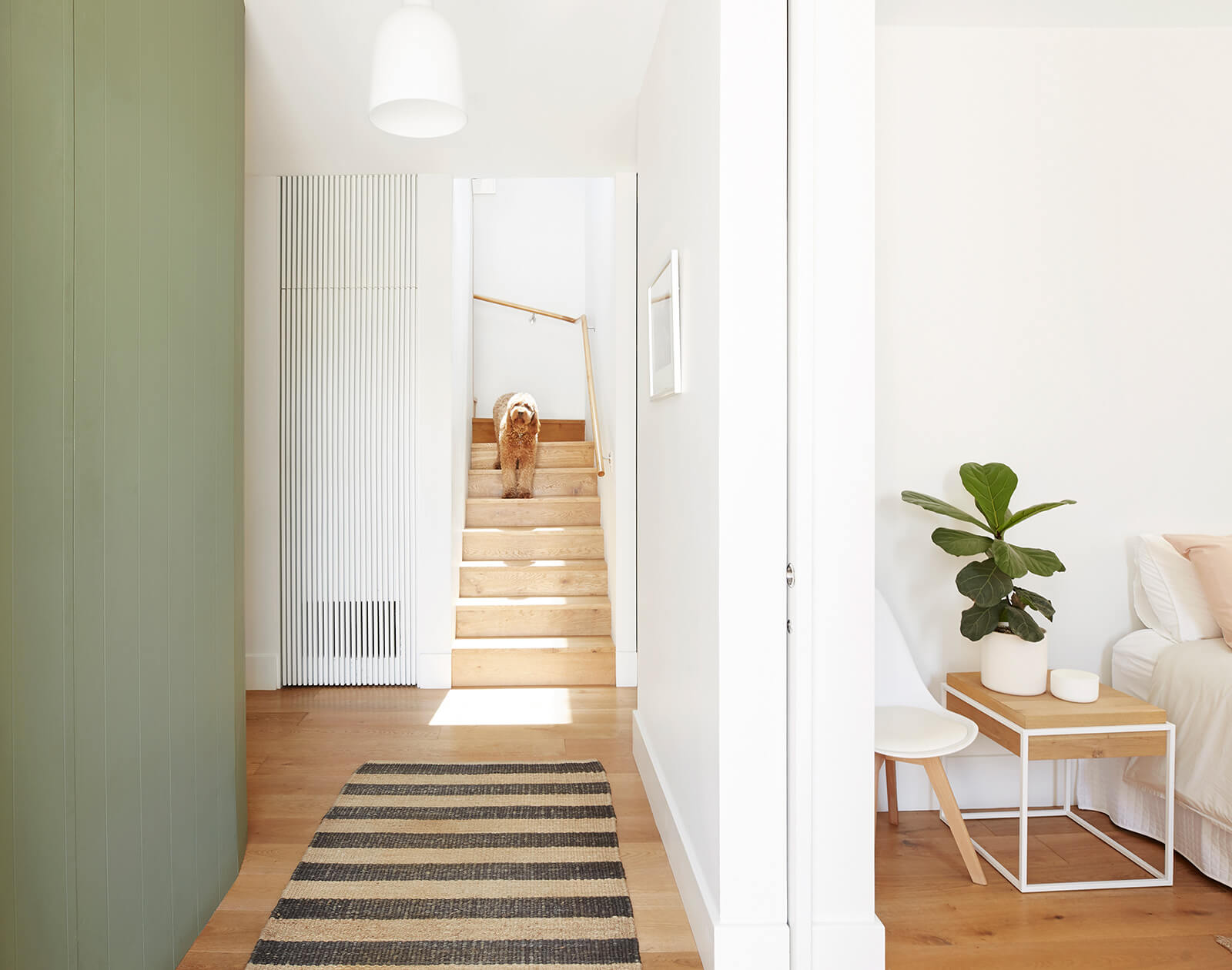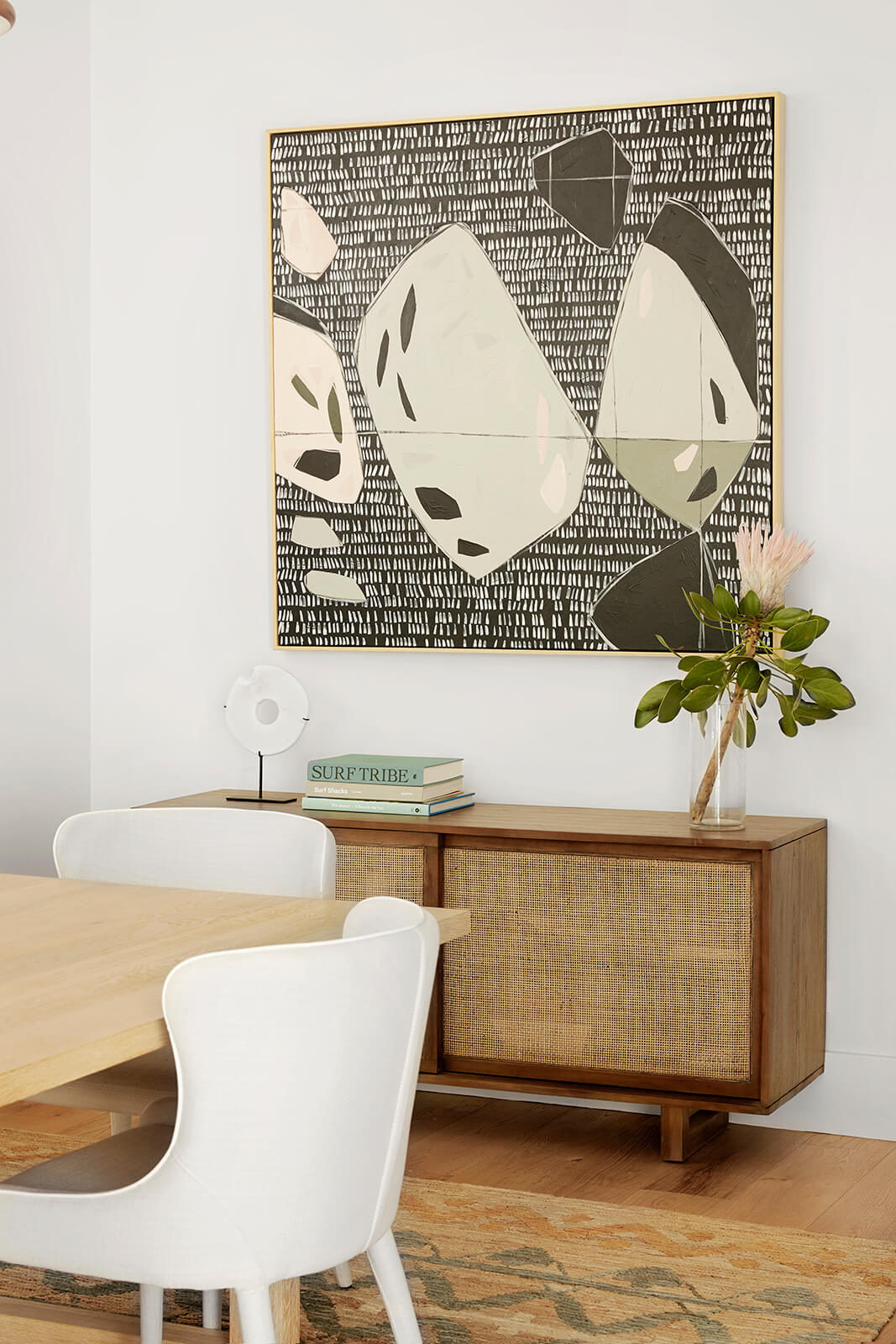 Contemporary with a modern finish defined by its subtle sophistication and deliberate use of colour, and clean lines, Leah was able to bring fun and function together. The dining room table was centred in the space along with a warm pendant light to create a more inviting setting. A display cabinet at the end of the table added the layer of storage whilst being ever so pretty and vibrant in aesthetic. This modern-day hacienda home ticked all the boxes for the family of four and dog Maggie.